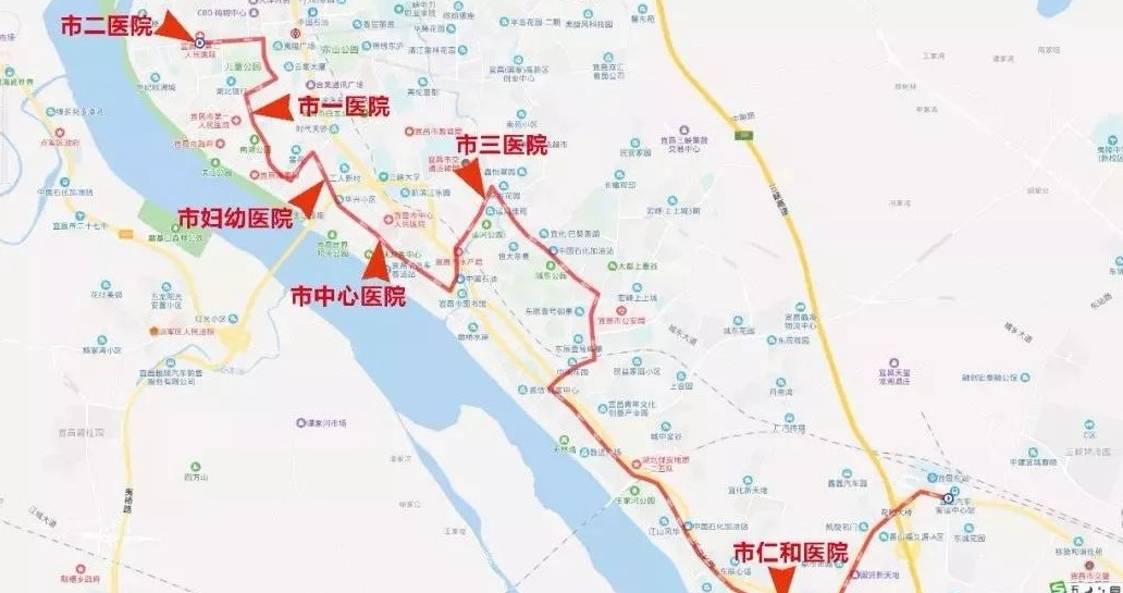 停靠站点:宜昌东站、桔城路(路侧)、五一广场(路侧)、仁和医院、金东方学校、王家河、江山风华、艾家嘴、虹桥国际公寓、伍家岗区政务服务中心、江晖景苑、碧波翠苑小区、中南铁路桥、三峡环球港、城东公园(巴黎香颂)、碧水林茵、三医院、港窑路、交运集团、十三码头、十中(万达广场)、宜昌中心医院、胜利三路、市妇幼医院、世纪花园、隆中路小学、隆康电信城、隆康路、峡州宾馆、儿童公园北门(凯盛美季酒店)、二医院。