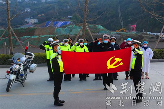 1月30日上午,在兴山县后河执勤点,该县公安局疫情防控后河执勤点临时党支部成立了,共吸纳来自交警、派出所民警、医生、护士、公路局职工等部门的党员18名。县公安局副局长万能顶宣读成立临时党支部文件后,临时党支部书记万波带领当天在岗的支部成员面向党旗庄严宣誓。随后,临时党支部现场召开第一次支部会议,部署当前卡口执勤重点工作。