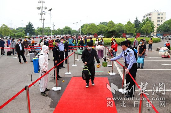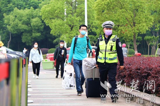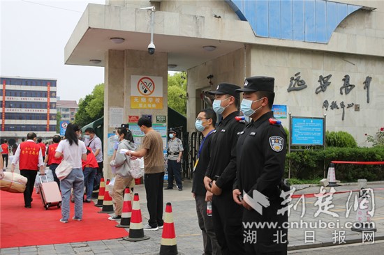 “车辆快速通过,家长不能进入校园……”在枝江一中门口,为了防止发生拥堵造成人员聚集,枝江交警在校门口专门设立了临时快速通道,方便家长短时间靠泊。迎来复学的同学们,戴着口罩,提着行李,保持间距,分批次、分通道,在接受消毒和体温检测后,有序进入校园。