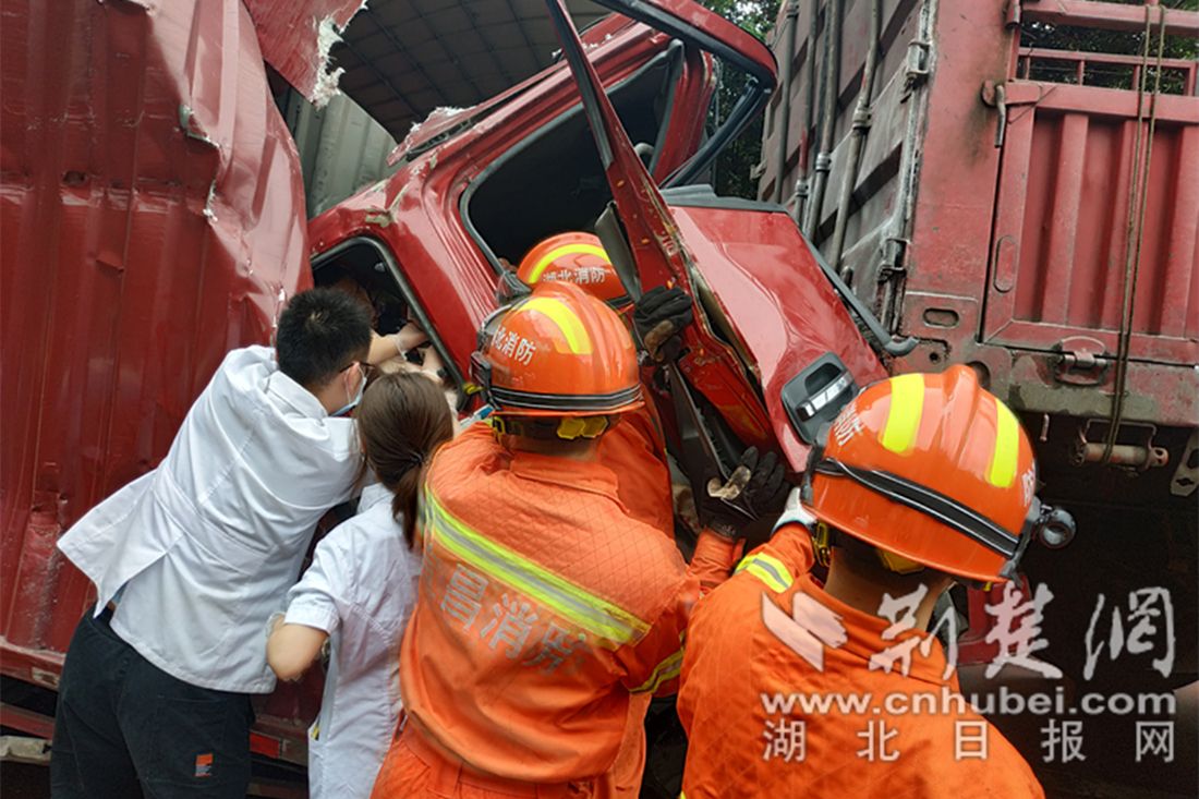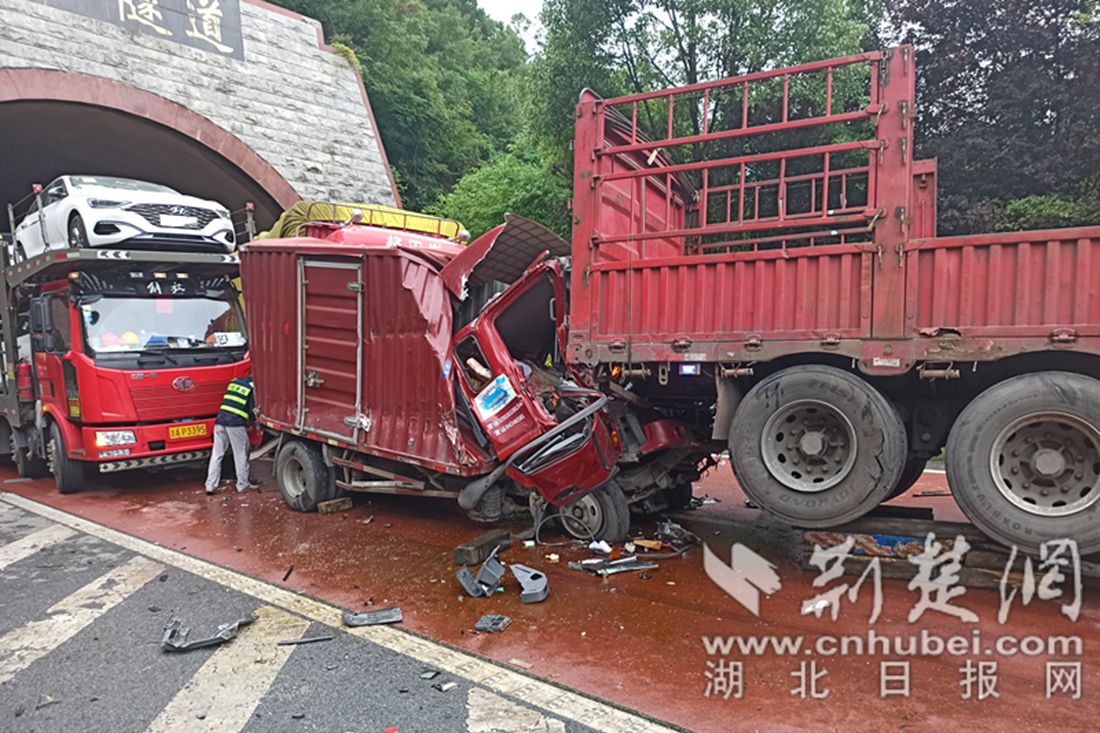 荆楚网客户端—荆楚网消息(通讯员伍文龙)13日13时48分,沪渝高速恩施往宜昌方向长阳贺家坪段长岭1号隧道口发生一起车祸,4辆货车连环追尾,两人受伤被困。事故发生后,当地消防、高警、路政、医疗等部门迅速赶往现场救援。