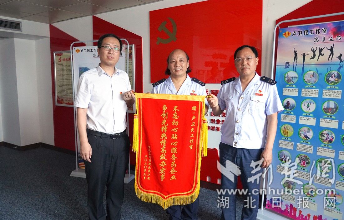 荆楚网客户端—荆楚网消息(记者闻玉强 通讯员危岩 实习生郑涛)6月17日,湖北宜化集团党委委员、总会计师张涛一行将一面印有“不忘初心贴心服务为企业 争创先锋热情高效办实事”的锦旗送至宜昌市税务局稽查局卢卫民工作室,对该局为企业解难题、办实事表示感谢。
