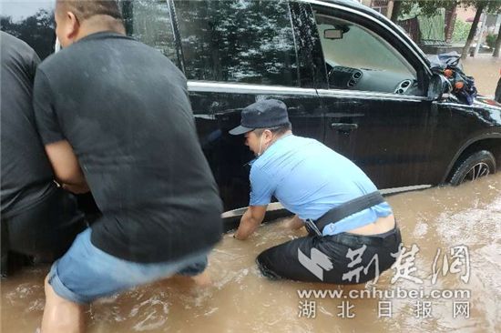 民警在洪水中抢救趴窝车辆。通讯员 供图