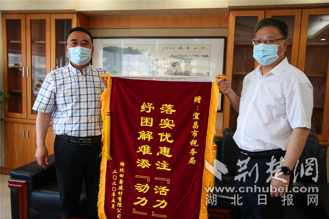 湖北田鑫建材有限公司向国家税务总局宜昌市税务局赠送锦旗,感谢疫情期间的帮扶。通讯员 杨凯 摄