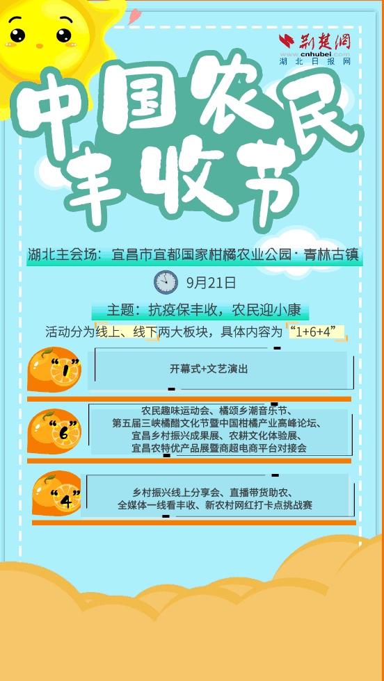 2020中国农民丰收节湖北主会场活动由湖北省农业农村厅和宜昌市人民政府共同主办。活动以“抗疫保丰收,农民迎小康”为主题,以“突出时代特点、突出宜昌特色、线上线下结合、节俭安全办节”为理念,目前各项筹备工作正在有序推进。