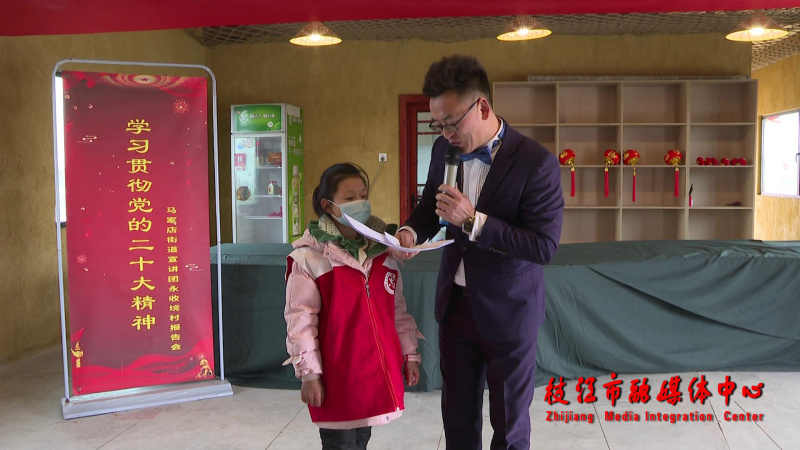 活动在永收垸村渔耕文化展厅举行,采用群众喜闻乐见的文艺宣传形式,邀请街道驻村干部、百姓宣讲团成员、年轻流动党员、大学生等进行党的二十大精神宣讲和交流学习,开展双人楠管说唱表演。同时,现场邀请儿童朗诵红色经典诗歌,围绕党的二十大精神开展有奖问答,让群众在趣味中学习,在轻松中入脑入心,“有料”又“有趣”。