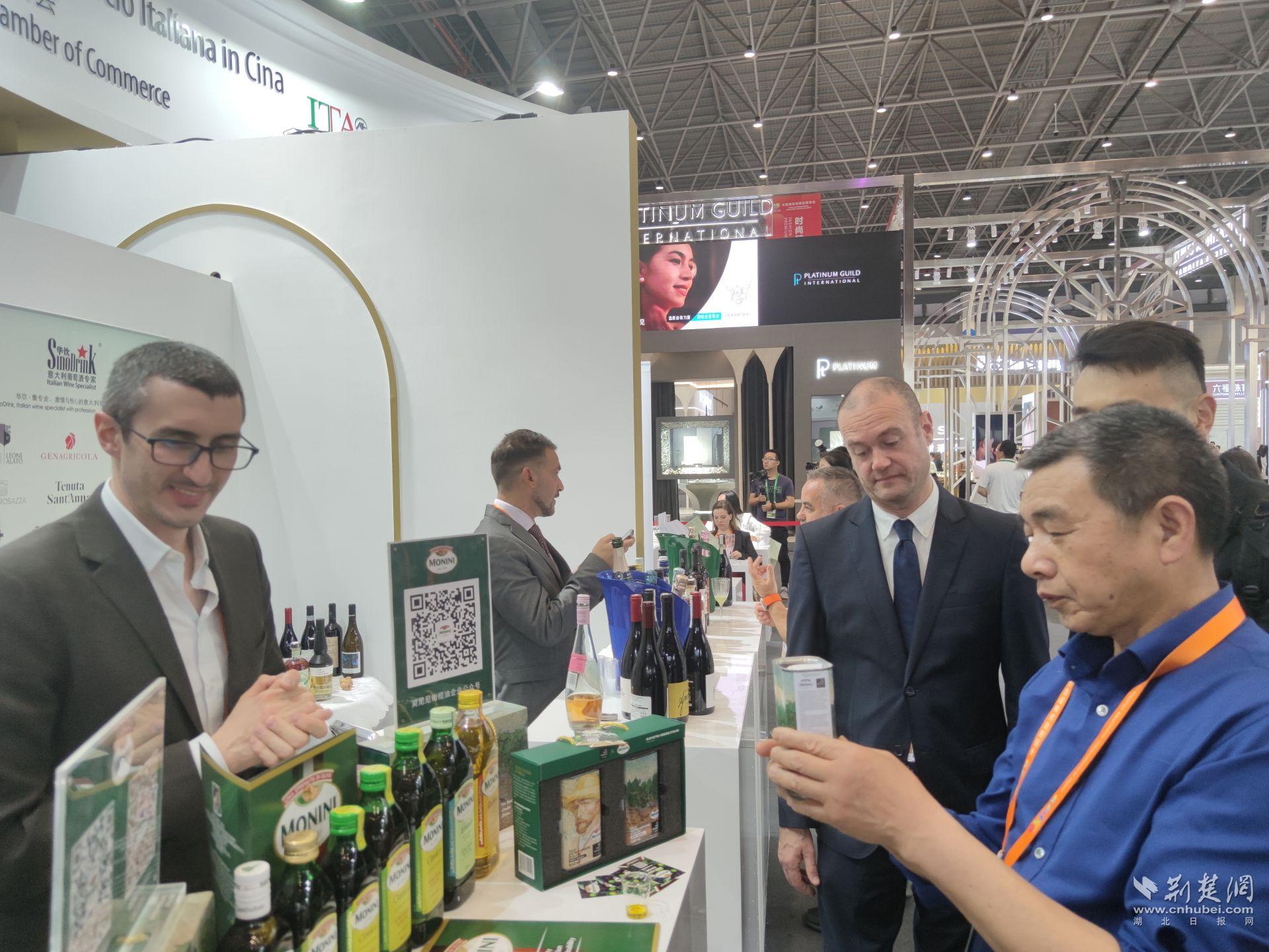 在意大利展区,参展橄榄油品牌MONINI负责人向宜都代表团详细介绍了公司产品,并向土老憨集团技术负责人了解了意大利风味橘醋相关情况,双方均期待未来能有合作机会。