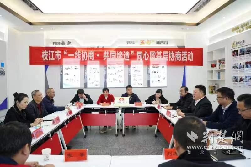 荆楚网(湖北日报网)讯(通讯员鲍子娟)4月25日,枝江市政协姚家港化工园协商小组围绕解决宜昌大生新能源开发有限公司员工交通出行问题,在该市政协经济界别委员工作室开展“一线协商·共同缔造”同心圆基层协商活动。枝江市政协副主席唐劲出席此次活动。企业员工代表,部分宜昌市、枝江市政协委员及相关单位负责人参加活动。