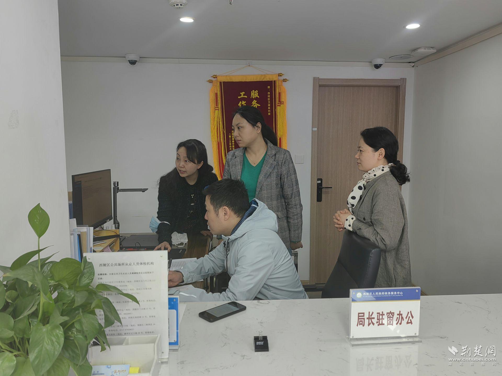 荆楚网(湖北日报网)讯(通讯员何敏)政务服务效率“高不高”?环节“优不优”?评价“好不好”?办事“便不便”?4月27日上午,宜昌市西陵区卫健局局长夏楠、副局长张春芳到该区行政服务中心卫健窗口驻窗办公,专门体验办事流程、记录办事全过程。
