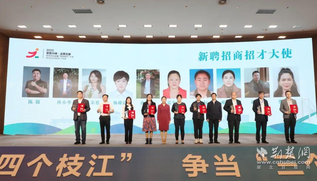 会上,枝江市新聘李永、姚冰、胡华琼、罗镇江、宋金华、李景鑫、徐杨巧、谭谦、徐正银、龚云波、陈源、孙小华、陈荣恩、欧阳琼、雷生姣、杨璐溢、唐传球、刘本权、赵宇、张俊彦20人为招商招才大使,表彰了史可、卢逢林、罗烽、易小华、尚爱民、林玉霖、聂小曼、杨德亮、刘容波、杨树10位优秀招商招才大使。大会现场还为来枝投身经济社会发展的8个人才代表、1个团队集中兑现7类人才政策奖励1012万元。