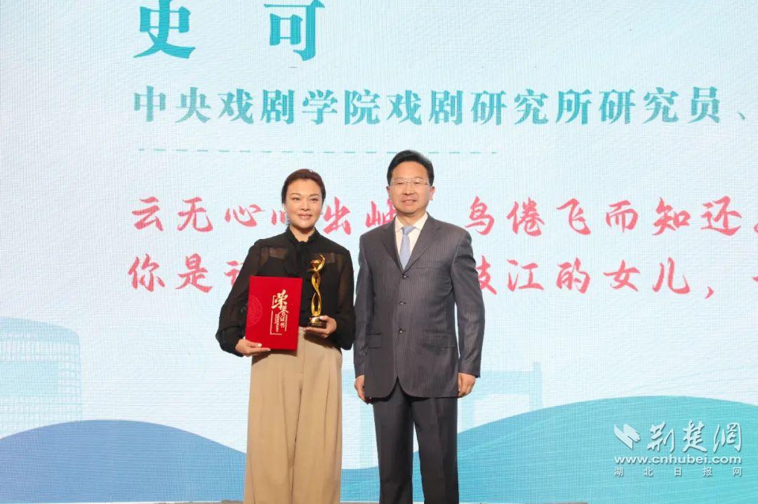 枝江市委书记余峰为中央戏剧学院戏剧研究所研究员、国家一级演员史可颁发优秀招商招才大使证书和奖杯。通讯员供图
