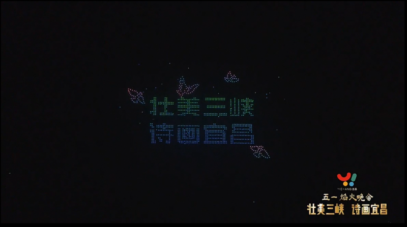 无人机群接连变换出“宜昌城市logo”“壮美三峡 诗画宜昌”“屈原”“昭君”“土家巴山舞”等字样和形态,向八方游客展现宜昌秀美的自然风光、灿烂的巴楚文化和浓郁的民俗风情。