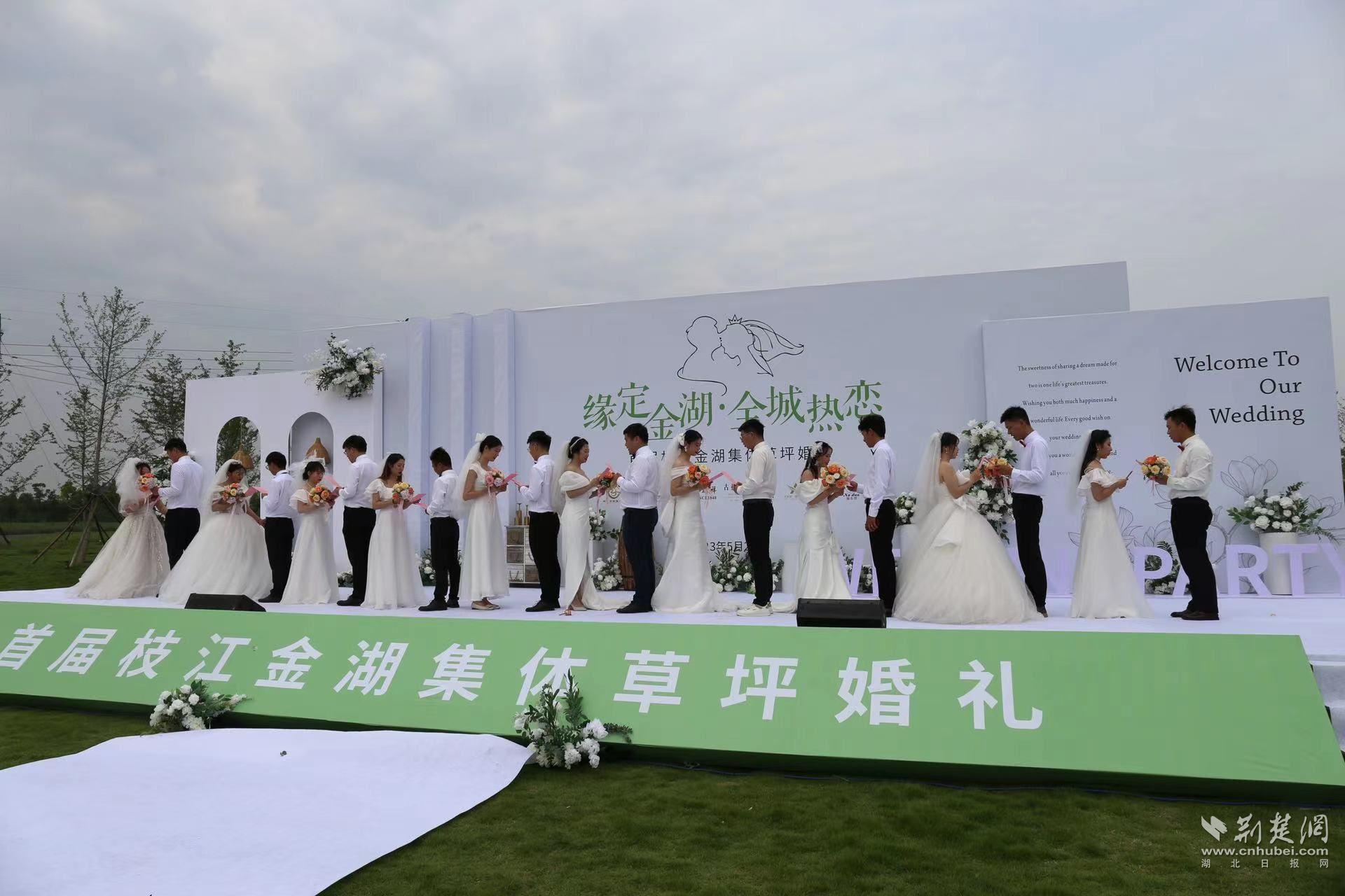 与此同时,以“缘定金湖·全城热恋”为主题的枝江市首届集体草坪婚礼在金湖国家湿地公园成功举行。10对新人身穿礼服,携手走上舞台,宣读结婚誓言、讲述爱情故事、抛花球……“喜上加喜,特殊的日子,特别的形式,这场婚礼我们将终身难忘!”“参加集体婚礼既省钱又省心,现场也喜悦氛围浓厚,大家都很高兴!”现场参加集体婚礼的新人们幸福感爆棚。