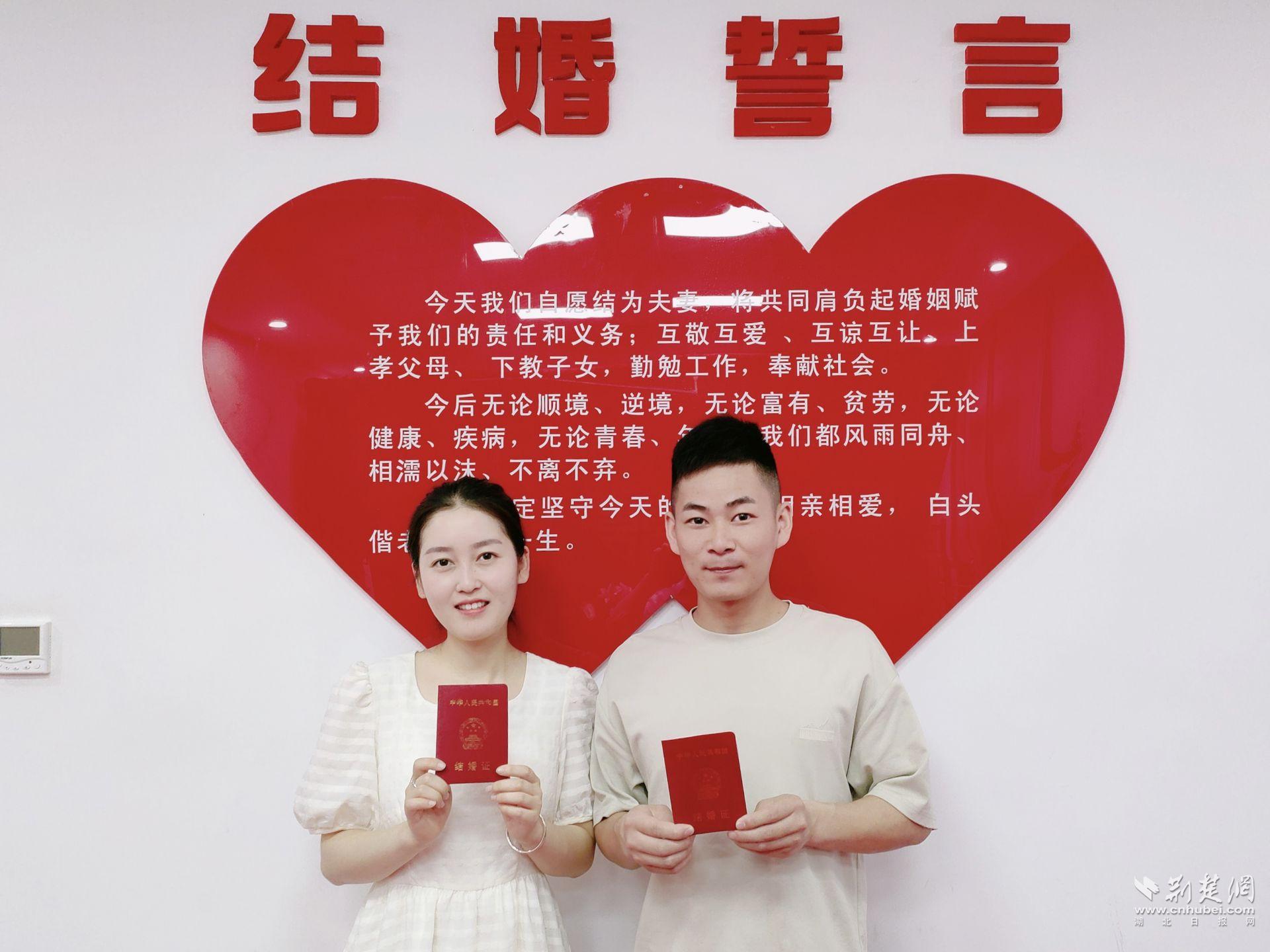荆楚网(湖北日报网)讯(通讯员胡雨涵、张书文)“我们结婚啦!”5月20日谐音“我爱你”,枝江市不少热恋中的情侣这天来到民政局登记结婚,开启人生新篇章。枝江市民政局婚姻登记处在当天为爱加班,用贴心的服务为新人送上了最温暖的祝福。