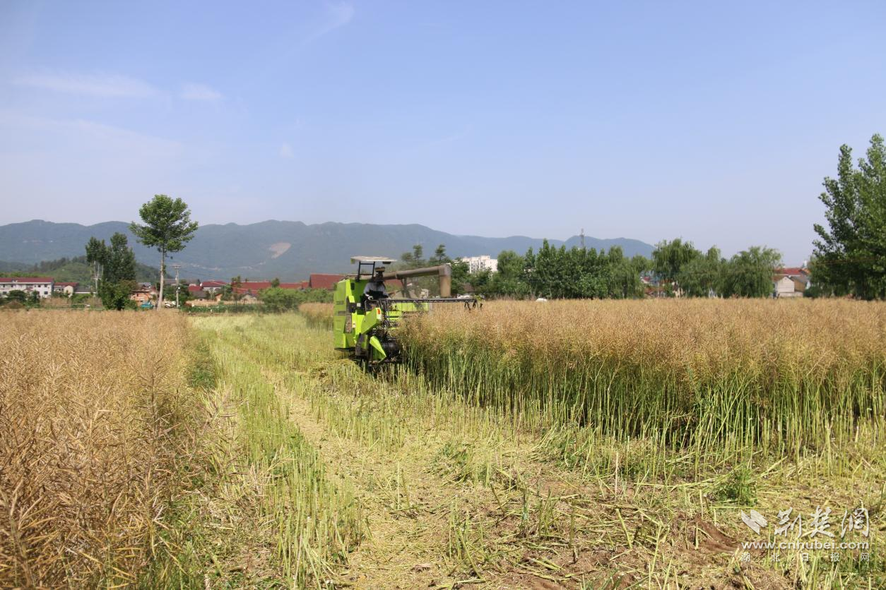 走进洋坪镇洋坪村,田野里一片金黄,饱满的油菜荚缀满枝头。伴随着马达声,油菜籽收割机在田间来回穿梭,一排排油菜杆被卷起,收割、脱粒等工序一并完成。