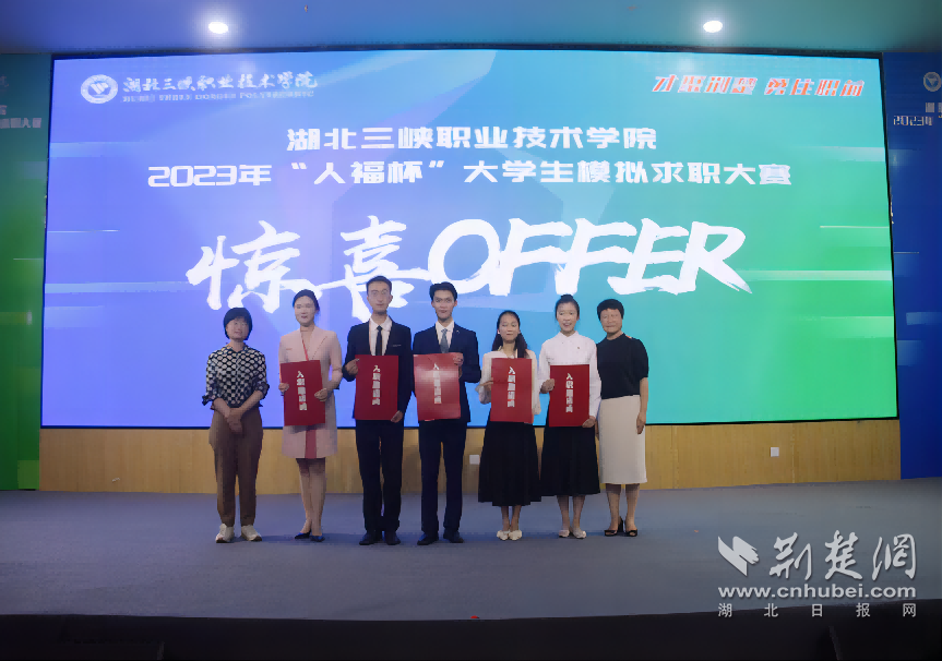 荆楚网(湖北日报网)讯(通讯员胡晖)6月9日下午,在宜昌市人社局、教育局的指导下,湖北三峡职业技术学院“才聚荆楚 勇往职前”2023年“人福杯”大学生模拟求职大赛决赛成功举办。来自宜昌人福药业等本土知名企业HR担任评委,比赛经过激烈角逐最终评选出一二三等奖和优胜奖。