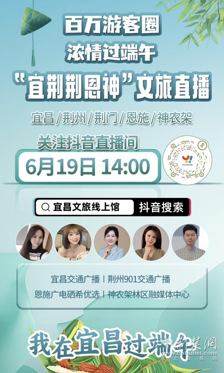 荆楚网(湖北日报网)讯(通讯员刘璐)百万游客圈,浓情过端午。6月19日,“宜荆荆恩神”端午融媒直播带货活动在宜昌文旅线上馆抖音直播间上线。