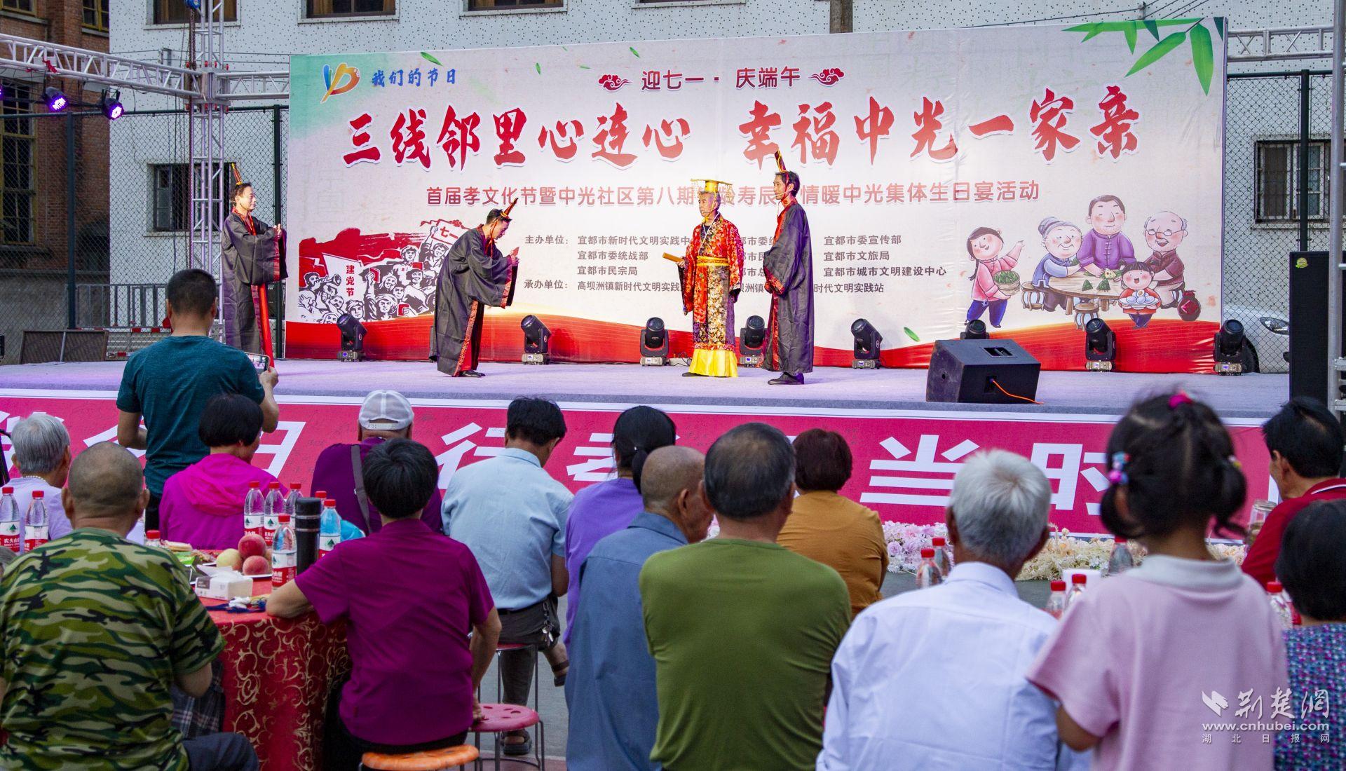荆楚网(湖北日报网)讯(通讯员陈希明、鲁玉梅、邹安琪、李文俊)6月21日,宜都市高坝洲镇中光社区举行“三线邻里心连心 幸福中光一家亲”暨首届孝文化节活动。社区居民、游客共500余人齐聚一堂,重温入党誓词、共庆老人生日、欣赏文艺表演,共庆端午佳节。