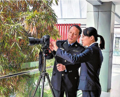 王忠(左)在指导青年干警如何取景拍出好照片。
