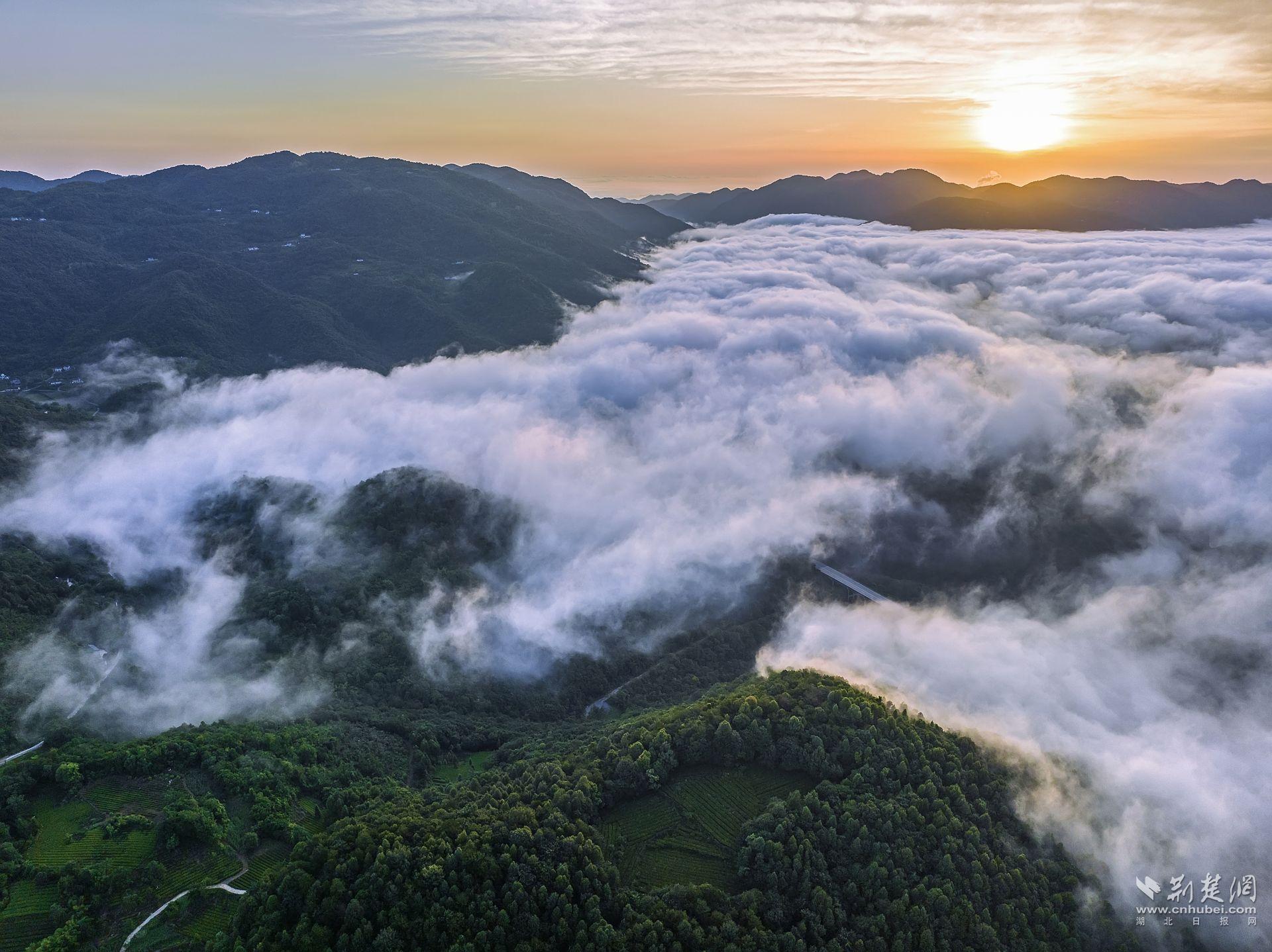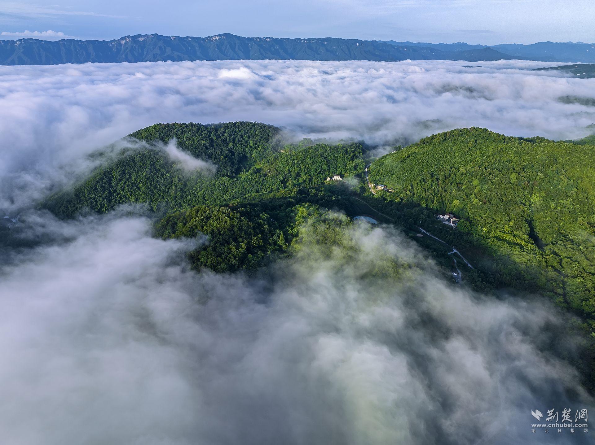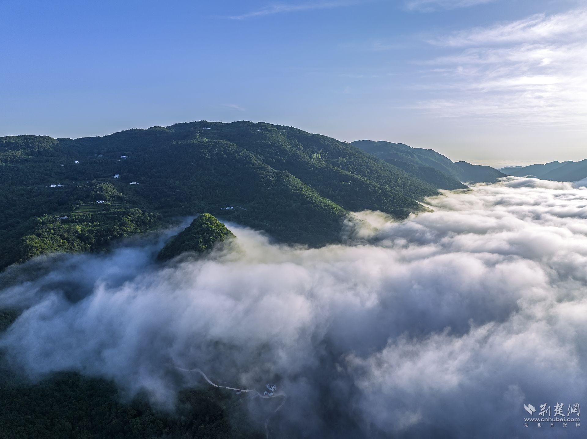 荆楚网(湖北日报网)讯(通讯员曹礼达)7月22日,宜都市潘家湾土家族乡与王家畈镇之间的渔洋河流域上空出现壮丽的云海景观。据气象专家介绍,该区域海拔在500米以上,昼夜温差较大,湿度较高,雨后极易生成云海奇观。