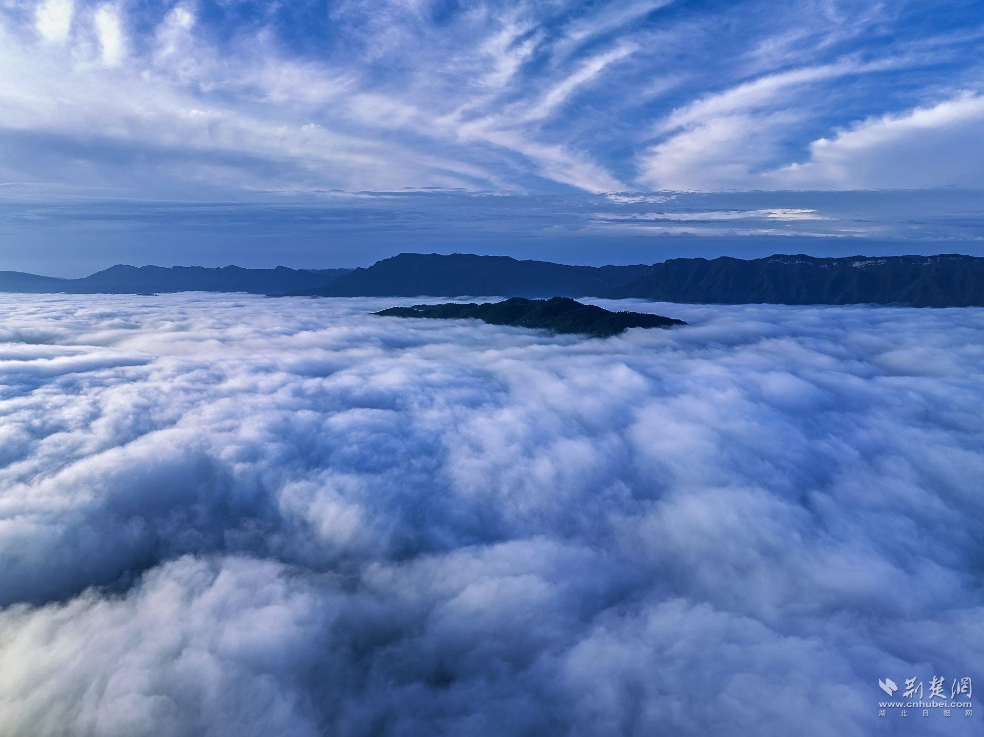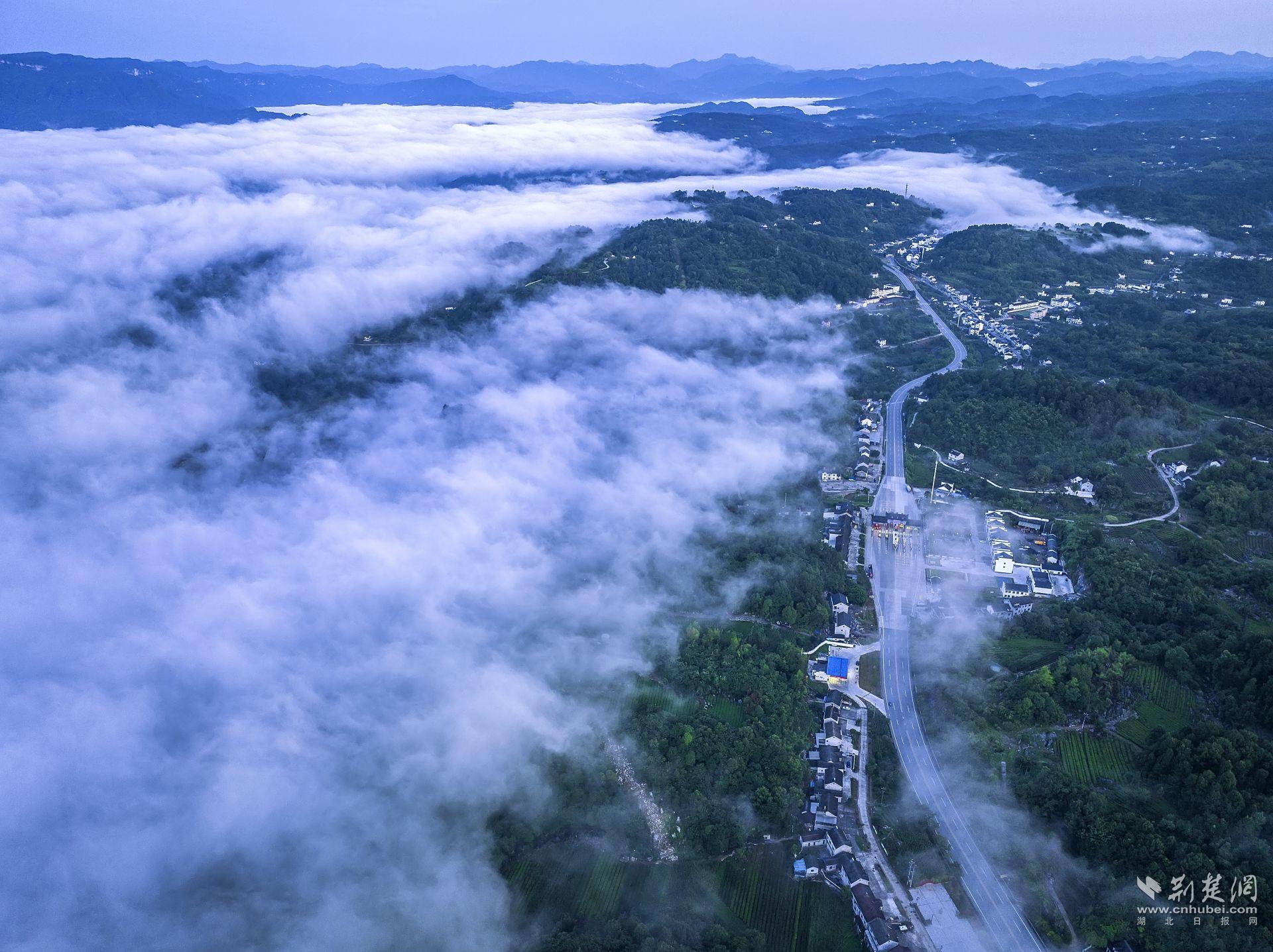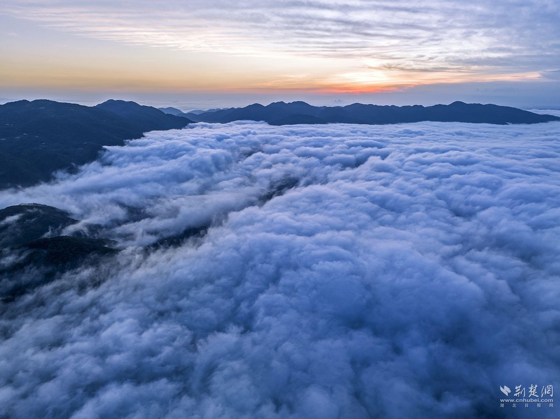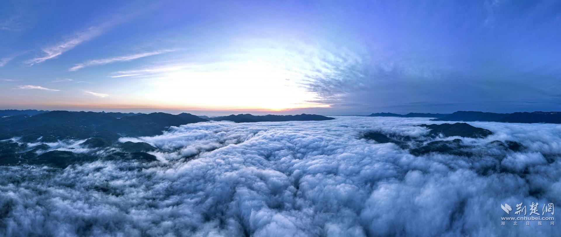 荆楚网(湖北日报网)讯(通讯员曹礼达)7月22日,宜都市潘家湾土家族乡与王家畈镇之间的渔洋河流域上空出现壮丽的云海景观。据气象专家介绍,该区域海拔在500米以上,昼夜温差较大,湿度较高,雨后极易生成云海奇观。