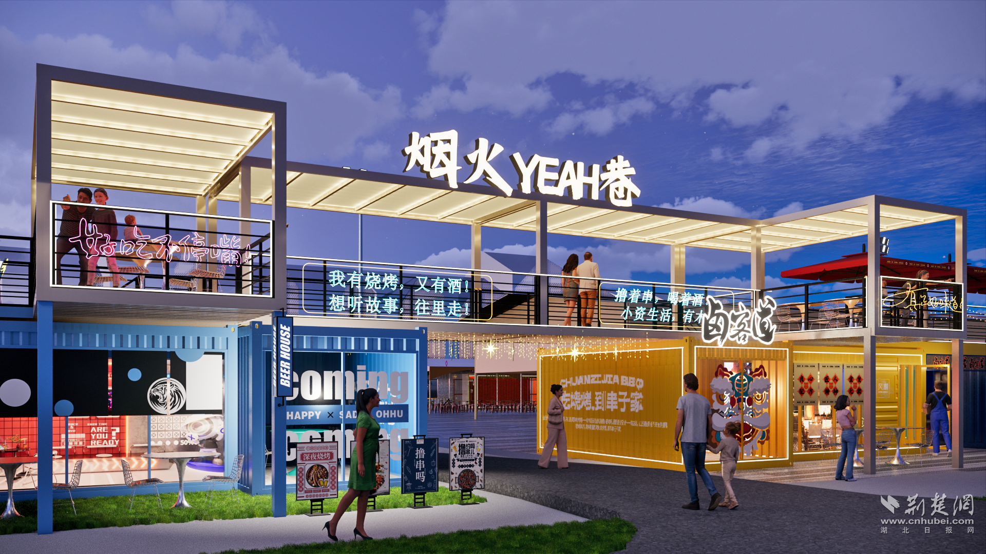 据介绍,夷陵烟火yeah巷是由湖北夷陵经发集团宜昌房地产有限公司倾情打造的,首个以“都市文旅夜经济·美食潮玩打卡地”为标签的城市消费场景街区。街区充分利用地形特点,形成三大分区、六大节点、两条动线的连贯布局,其中三区为特色餐饮+小吃集群的美食区,萝卜饺子、凉虾等上百种美食可满足不同消费者的味蕾;二区为潮玩市集+活动演绎的休闲区,包含新颖有趣的儿童游乐设施和各类网红潮玩贩售车集市,可满足亲子消费群体的游玩娱乐需求;一区为城市露营+深夜酒馆的打卡区,各类网红氛围元素分布其中,星空屋顶玻璃房、驻唱乐队将为市民朋友营造舒适放松的小酌氛围。目前,夷陵烟火YEAH巷已经吸引了105家优质商户。