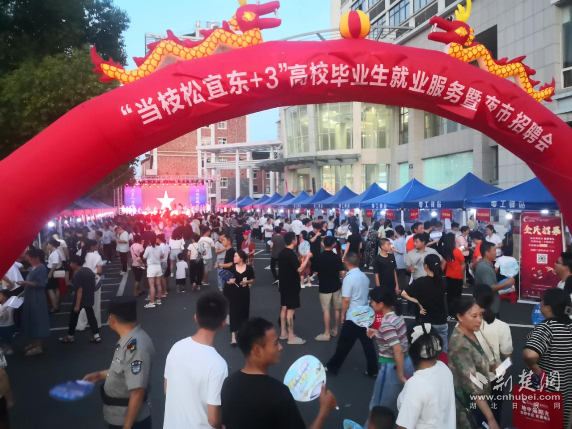 当晚,宜都的招聘夜市热闹“开张”,60余家企业参与招聘,其中宜都市外企业16家,参与招聘的企业提供就业岗位2800余个。招聘摊位前围满了求职者,大家一边品尝美食,一边寻找适合自己的岗位。据统计,当晚共吸引5000余人次进场应聘,1280人与企业达成就业意向。