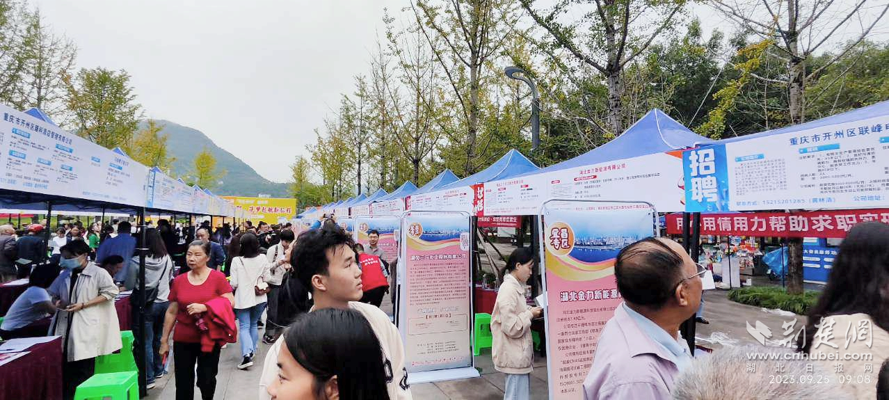 荆楚网(湖北日报网)讯(通讯员高蓓)“这个岗位薪资待遇怎么样?”“岗位有什么要求?”“什么时候可以去上班?”9月25日上午9时,“天生云阳”金秋节招聘活动在重庆市云阳县清风广场举行。本次活动由宜昌市人社局、重庆云阳县人社局等川渝鄂人社部门联合举办,宜昌共组织20家企业进场招聘,岗位需求1700余人,110人达成就业意向。
