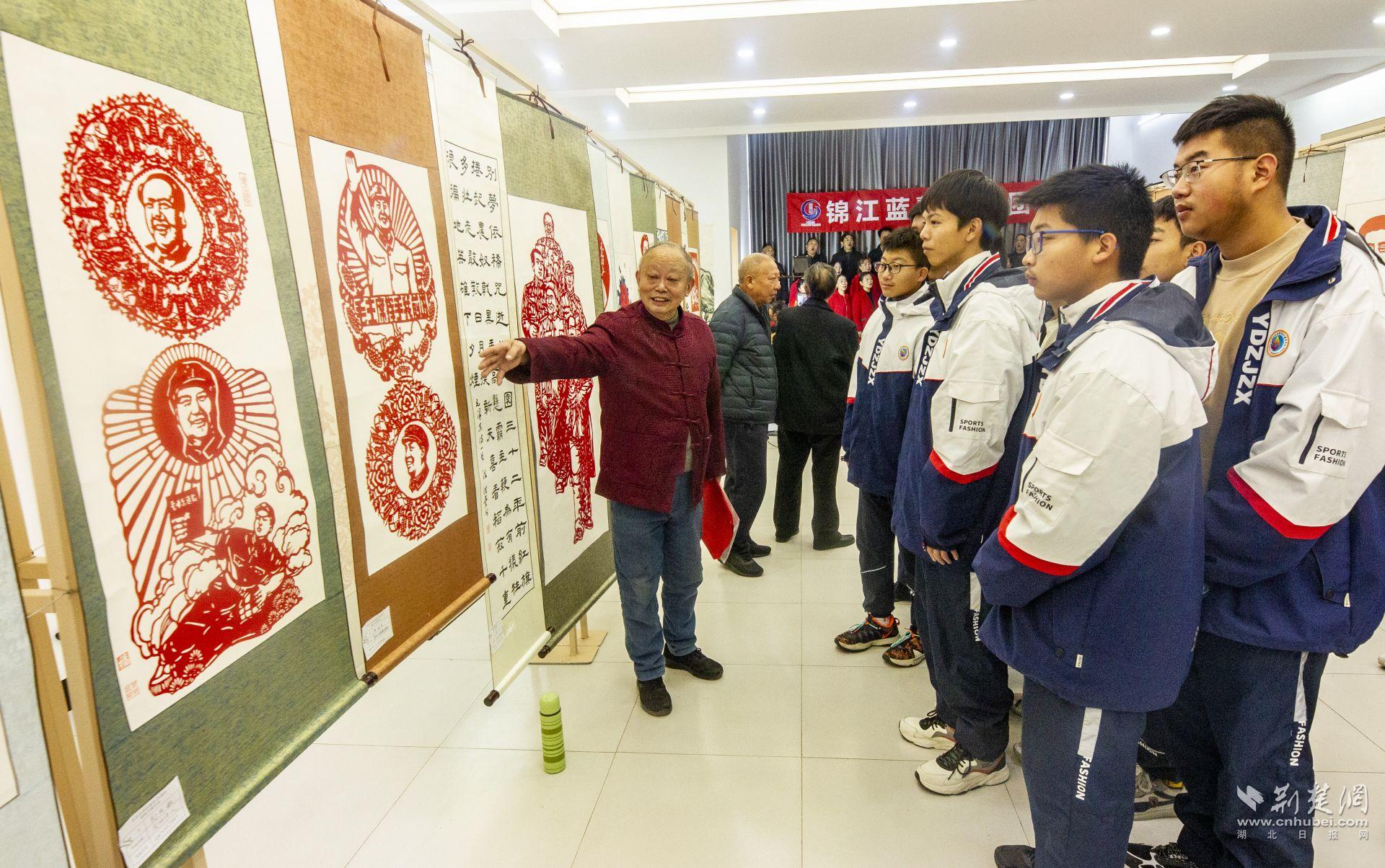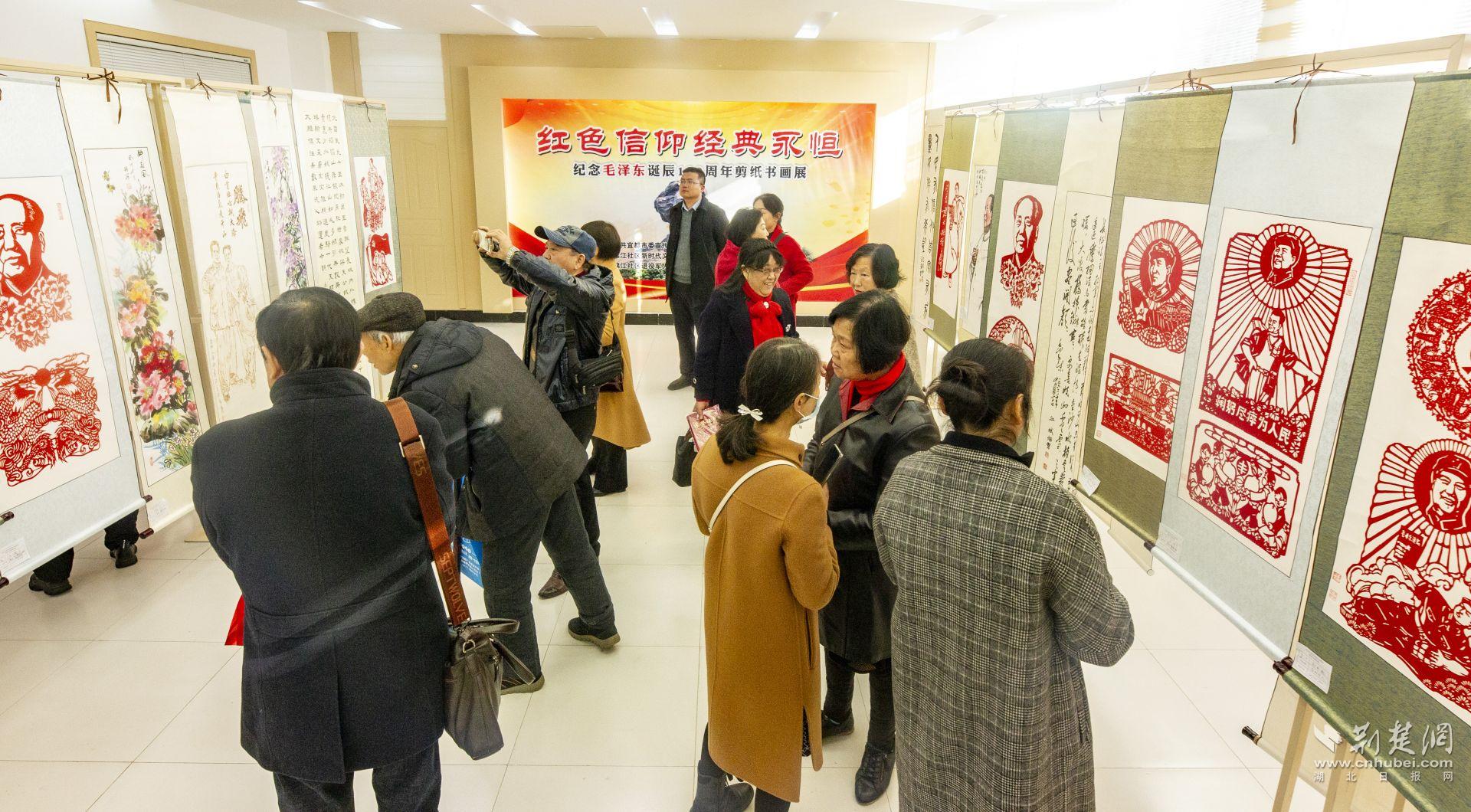 荆楚网(湖北日报网)讯(通讯员易江龙)12月8日,“红色信仰 经典永恒—纪念毛泽东诞辰130周年剪纸书画展”在宜都市陆城街道锦江社区举办。