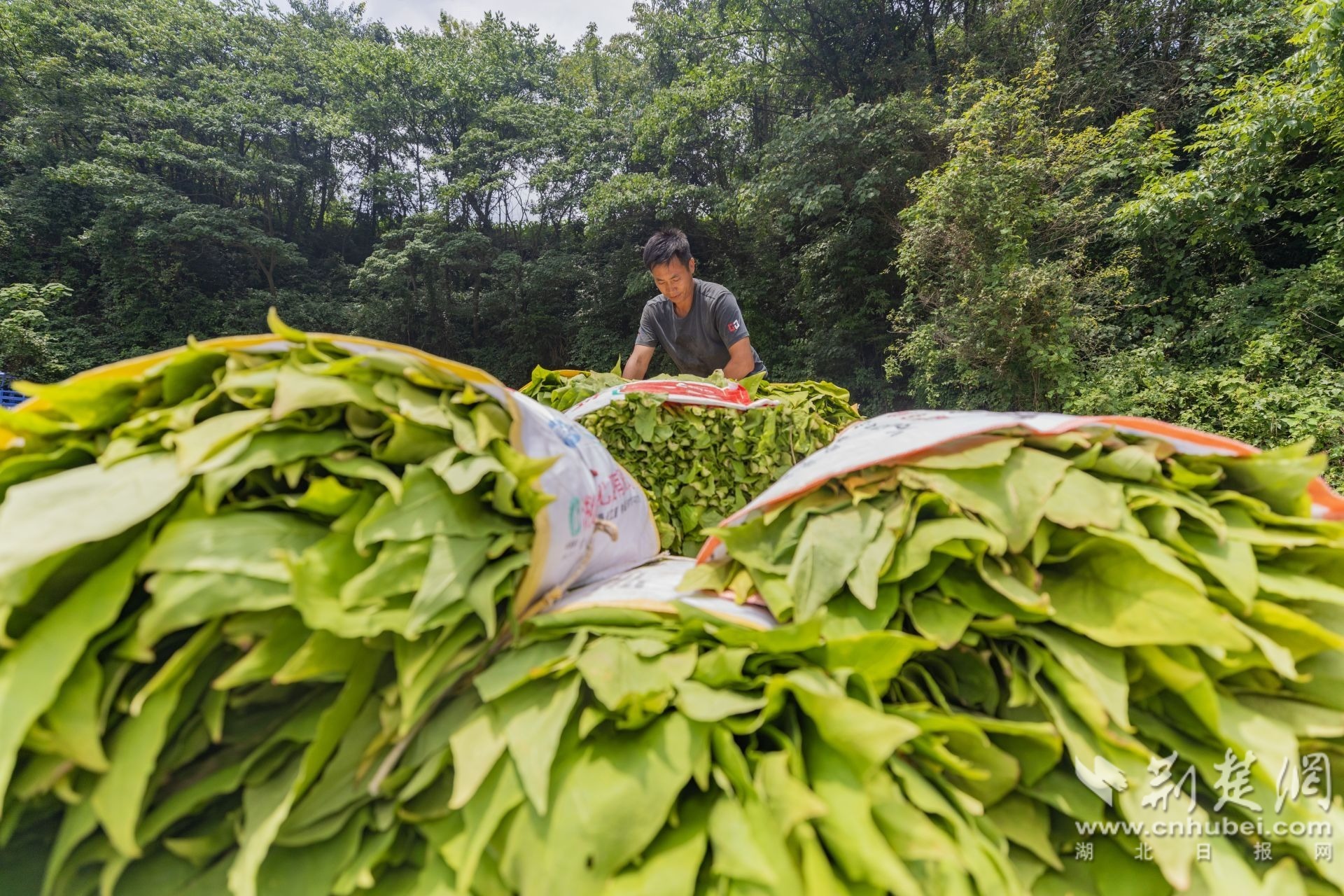7月11日,秭归县郭家坝镇荒口坪村的首批烟叶正式开采。连绵的烟田里,碧绿的烟株随风起伏,宽大肥厚的叶片随风摇曳,泛起层层绿浪。头戴草帽、身着罩衣的工人们工人们头戴草帽,俯身、旋茎、采叶,动作一气呵成,臂弯里的烟叶迅速垒高。