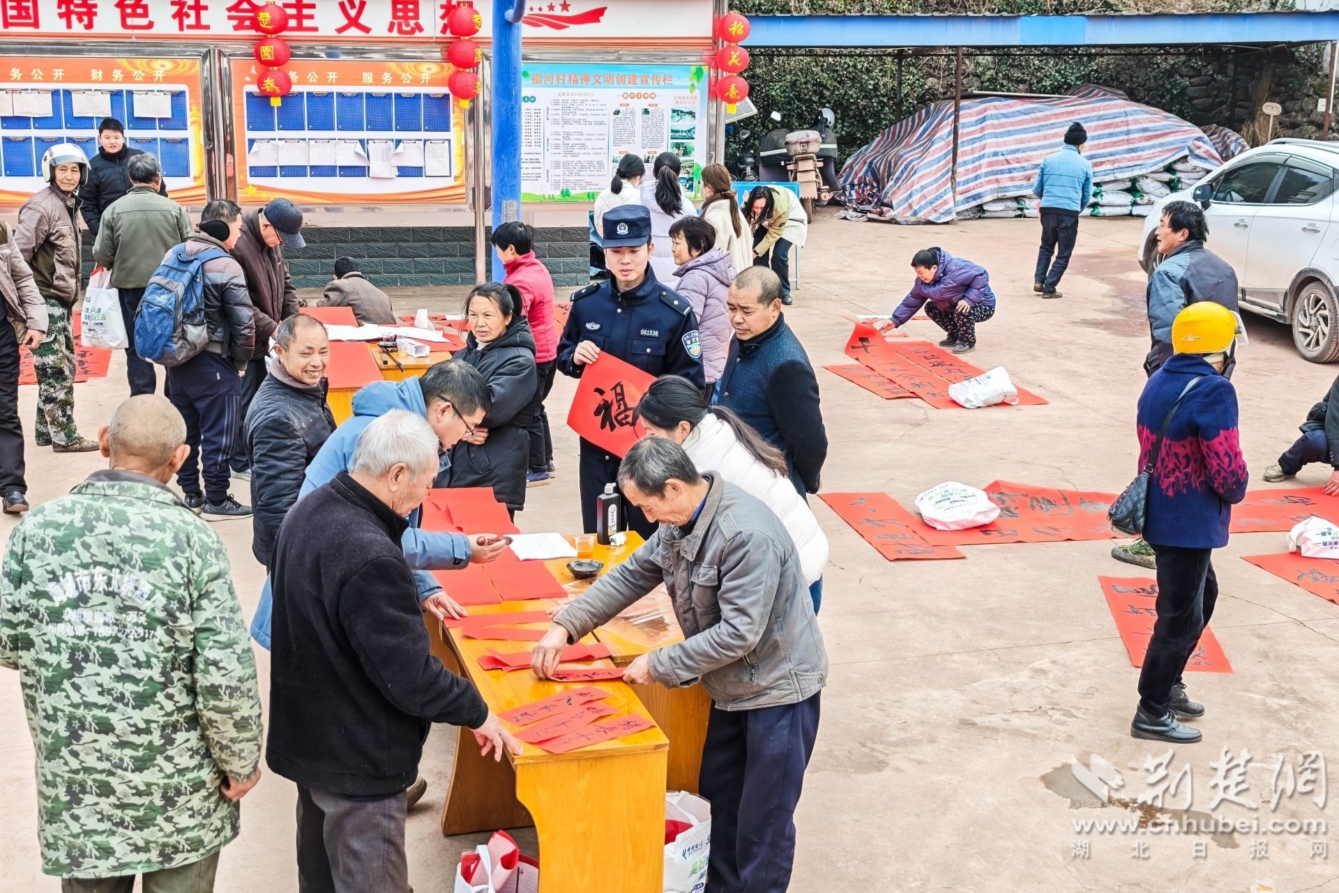 荆楚网(湖北日报网)讯(通讯员刘艳、望娟娟)2月4日,立春时节,远安县茅坪场镇福河村村委会院子里春意融融。一幅幅大红的春联一字排开,空气中弥漫着淡淡的墨香与欢快的谈笑声。这里正在举行的“迎春送福”活动,让小山村提前漾开了春节的喜庆。