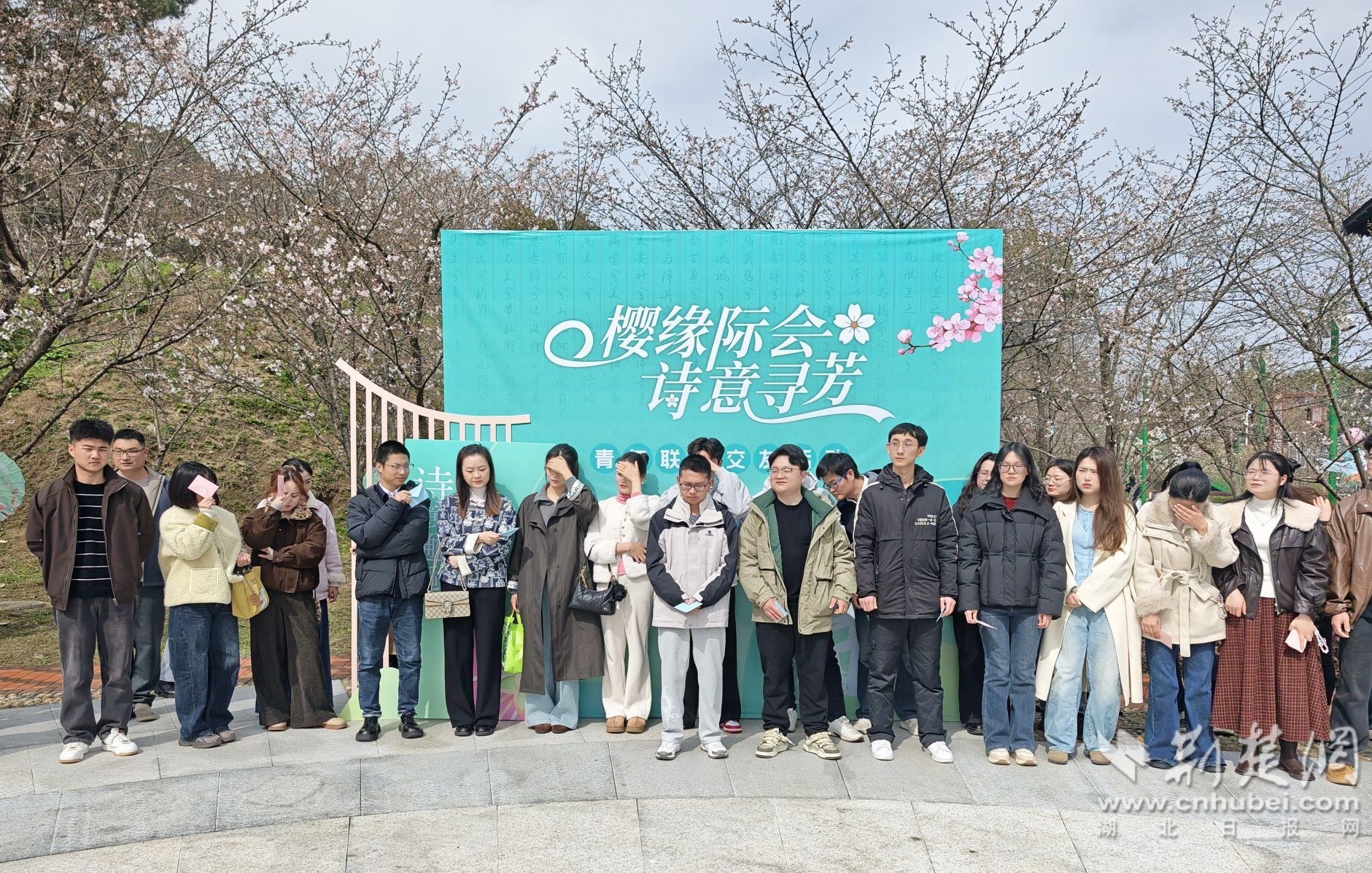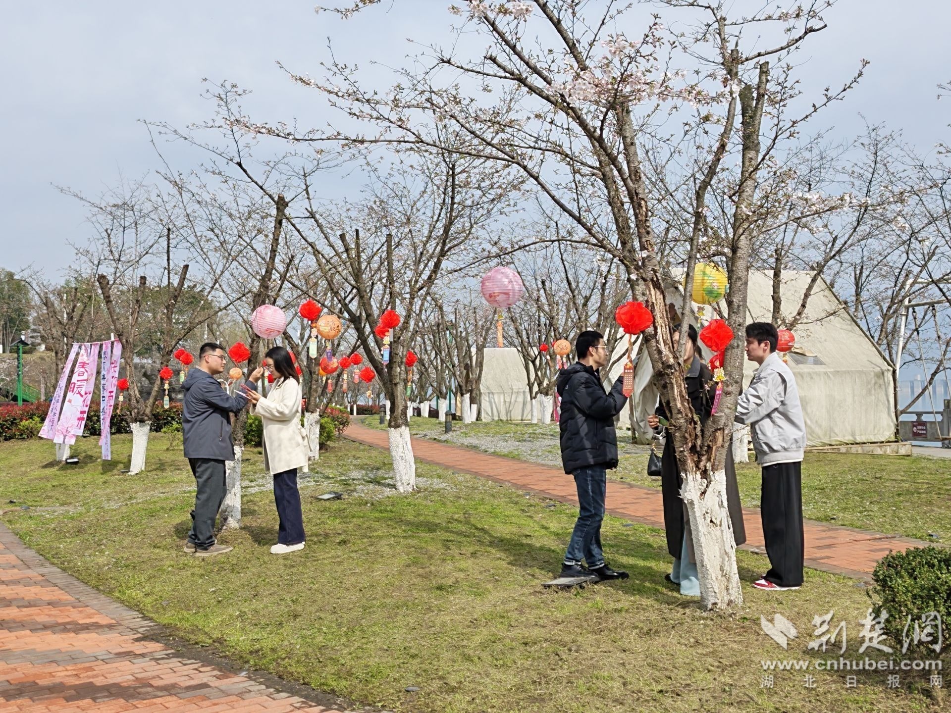 樱花树下,垂挂的灯谜随风轻摆,青年们或仰头苦思、或蹲地比划,猜出谜底时相视一笑,思维的火花在浪漫的空气中碰撞。