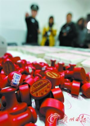 公安人员在陈某夫妇的仓库和住所缴获各市县酒店宾馆印章95枚。 记者高鹤涛 摄