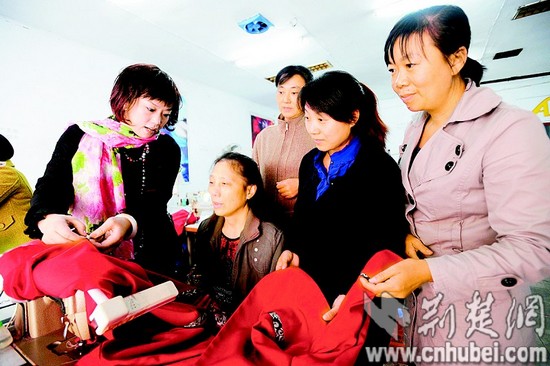 图为:襄阳市樊城区政协委员郝涛(左)正在给无业的中年妇女们传授缝纫技术。(记者 杨平 摄)