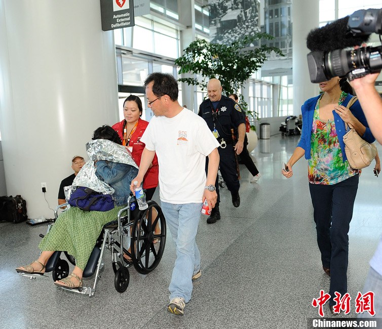 当地时间7月6日,一架从韩国飞往美国旧金山的韩亚航空公司的波音客机在着陆是失事,到截稿时,已有2人死亡,61人受伤。图为乘客因伤送医。中新社发 陈钢 摄