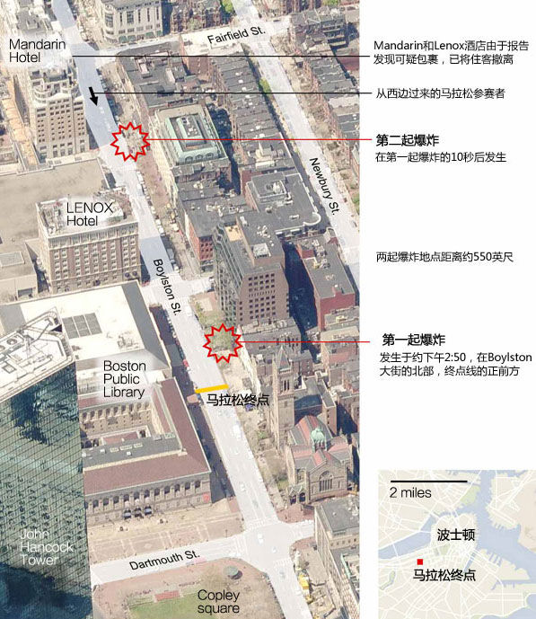 波士顿警方和波士顿马拉松比赛组织者证实,其中两起炸弹爆炸发生在波士顿马拉松比赛终点线附近,造成至少两人死亡,另有23人受伤。也有美国媒体报道,受伤者人数已上升到100多人。