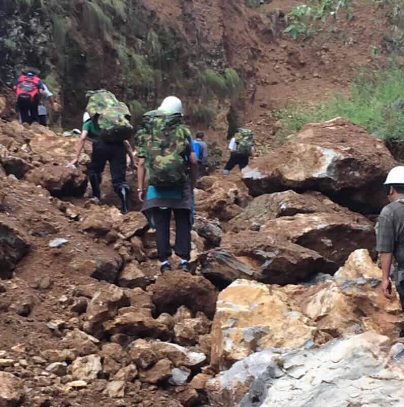 第二条微信的时间是13点04分。四张照片上,医疗队员们背着睡袋和救灾物资,攀爬在乱石林立的山涧,身旁和脚下到处都是从山上滚落下来的巨大石块。在喜怒无常的大自然面前,他们身影显得格外渺小。文字只有短短的一句话,更像是他们此次行动的一个宣言:“最艰苦的点二院担,艰难挺进八宝村。”