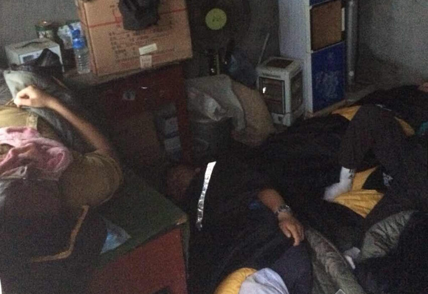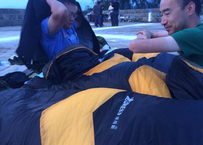 睡在地上的几位,好歹还有一个睡袋,而睡在长条桌上的他,只有一块毛巾搭在胸口,一个晚上,眼镜都没摘下来。