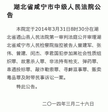 据咸宁市中级人民法院官方微博消息,湖北省咸宁市中级人民法院今日发布公告,该院定于2014年3月31日8时30分在湖北省通山县人民法院第一审判法庭公开审理湖北省咸宁市人民检察院指控被告人曾建军、张伟、曾建、闵杰、李君国犯参加黑社会性质组织罪、故意杀人罪、非法持有枪支、弹药罪、串通投标罪、敲诈勒索罪、寻衅滋事罪、贩卖毒品罪及附带民事诉讼一案。