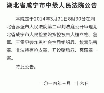据咸宁市中级人民法院官方微博消息,湖北省咸宁市中级人民法院今日发布公告,该院定于2014年3月31日8时30分在湖北省赤壁市人民法院第二审判法庭公开审理湖北省咸宁市人民检察院指控被告人桓立柱、詹军、王雷犯参加黑社会性质组织罪、故意伤害罪、非法持有枪支罪、开设赌场罪、窝藏罪一案。