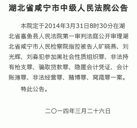 据咸宁市中级人民法院官方微博消息,湖北省咸宁市中级人民法院今日发布公告,该院定于2014年3月31日8时30分在湖北省嘉鱼县人民法院第一审判法庭公开审理湖北省咸宁市人民检察院指控被告人旷晓燕、刘光辉、刘淼犯参加黑社会性质组织罪、非法持有枪支罪、骗取贷款罪、隐匿会计凭证、会计账簿罪、非法经营、赌博罪、窝藏罪一案。