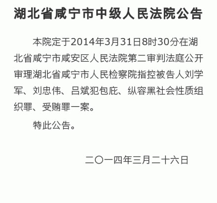 据咸宁市中级人民法院官方微博消息,湖北省咸宁市中级人民法院今日发布公告,该院定于2014年3月31日8时30分在湖北省咸宁市咸安区人民法院第二审判法庭公开审理湖北省咸宁市人民检察院指控被告人刘学军、刘忠伟、吕斌犯包庇、纵容黑社会性质组织罪、受贿罪一案。