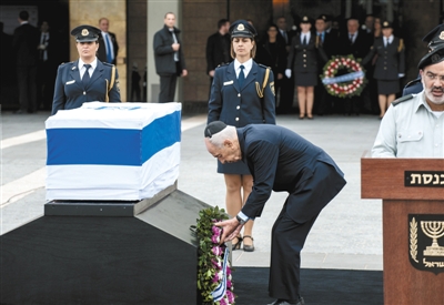 1月12日,以色列议会广场,以色列总统佩雷斯向沙龙棺椁献花圈。