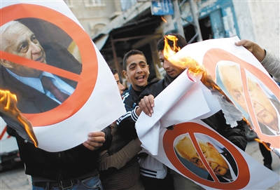 1月12日,巴勒斯坦民众焚烧印有沙龙的画像。