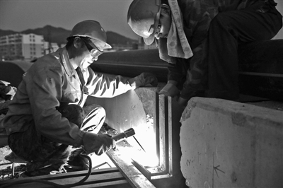 10月2日,江西省吉水县赣江二桥施工现场,来自河北衡水的老彭(左)和他的工友正在焊接桥梁伸缩缝。为赶在10月底顺利竣工通车,负责桥面铺装的工人们放弃休假,抓紧赶工。 许祖平摄