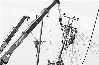 10月1日,国网江西省新余市渝水区供电公司员工在水西镇大富桥村抢修线路,确保国庆供电。经济日报记者 刘 兴摄