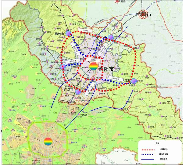 同时,加强德阳中心城区连接广汉、什邡、绵竹、罗江的城市发展轴以及德阳至中江快速通道建设。在此基础上,规划县域中心城市向周边市县辐射的延伸线,改造市域重点镇、产业园区、旅游景点等连接道路。