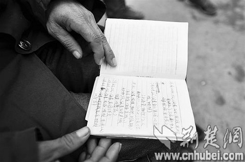 图为:何运香不识字,每天晚上由丈夫邓双生将账目记录在本子上,依据这个账本,邓双生在妻子遇难后将工钱一一发放给工友。