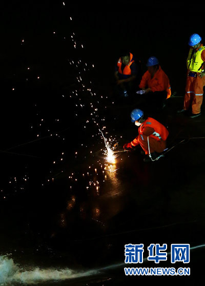 救援人员对客船“东方之星”轮的底部进行切割作业以便救援(6月3日摄)。 新华社记者 肖艺九 摄
