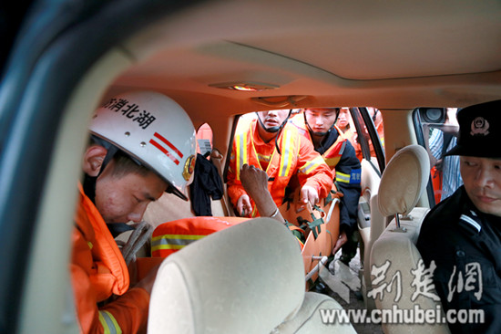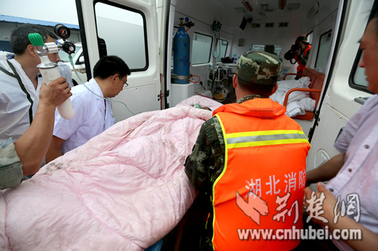 21岁的陈书涵被湖北消防官兵、医护人员送上救护车