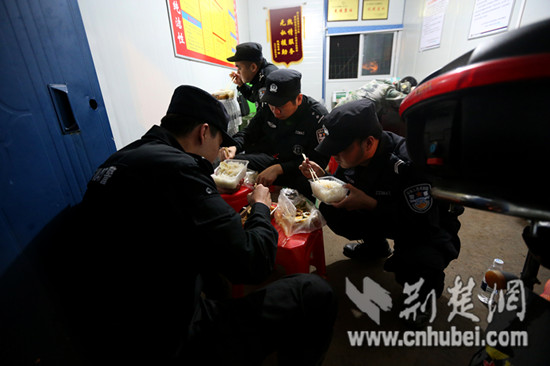 深夜,执勤特警终于吃上了晚饭